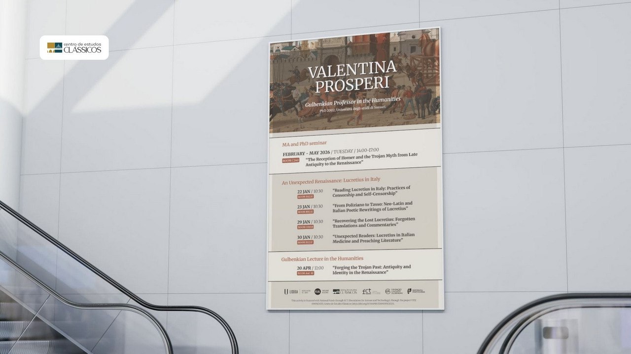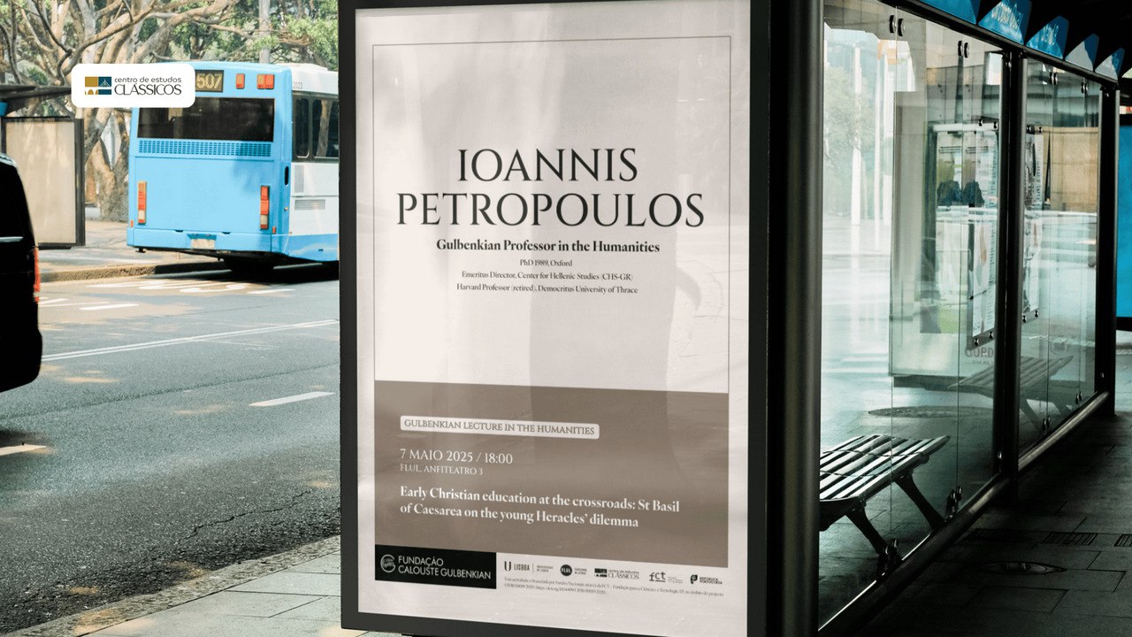Além da infraestrutura digital, o Centro precisava de materiais visuais para o seu ciclo de conferências — cartazes que transmitissem a seriedade académica e a relevância contemporânea dos estudos clássicos.